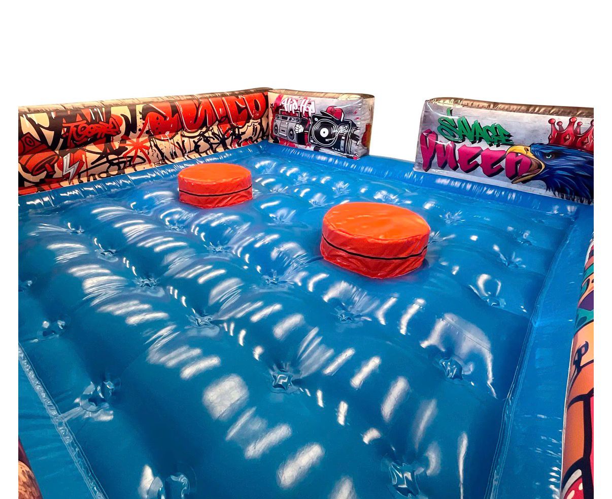 Estrutura inflável, cotonetes de espuma e arena protegida garantem disputas emocionantes sem risco de acidentes.